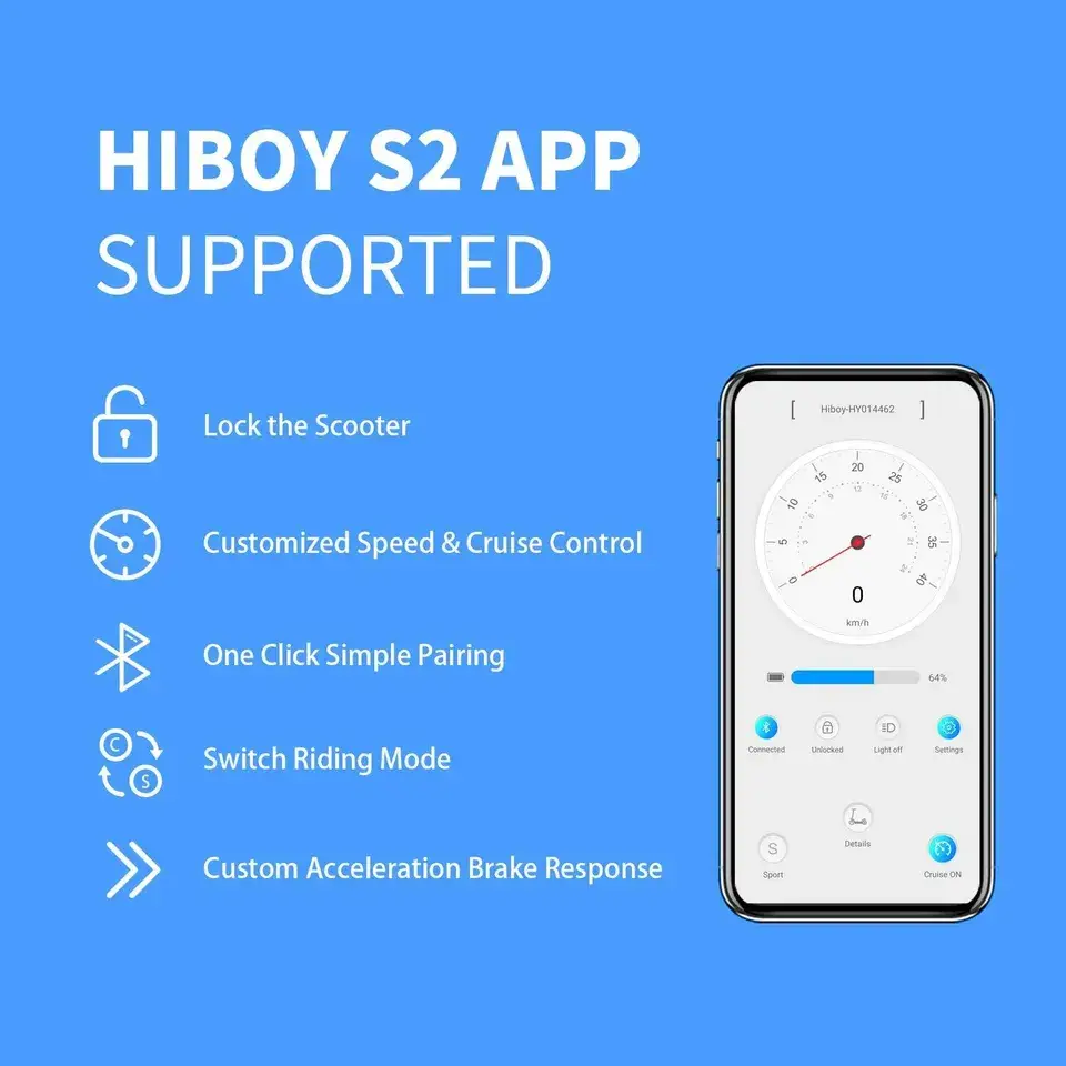 - Hiboy S2 App – Simply connect Hiboy electric scooter’s app to lock your scooter, to customize the scooter acceleration and braking responses.Or you can use the scooter without connecting app.It’s your choice!